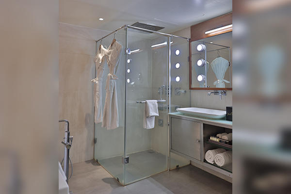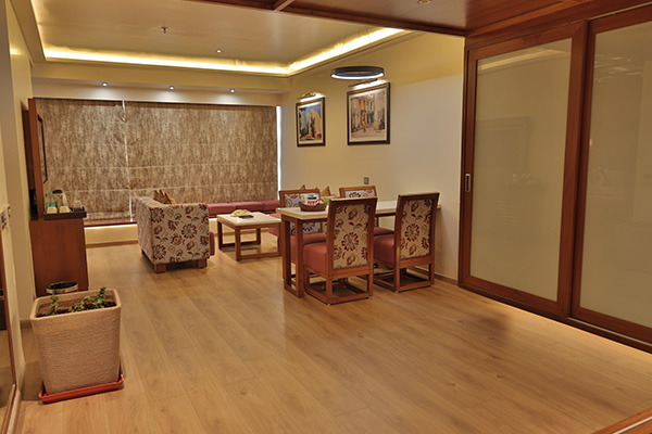 “Spacious, bright and ocean facing rooms measuring 650 sq ft. The suite category room comes with living room and dining table, its equipped bathtub with inbuilt Jacuzzi, LCD in both bedroom and living room. Beautifully furnished and spacious bathroom, with see-through glass in the bathroom.”